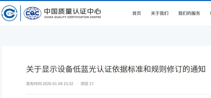 2026 年 1 月 4 日,中国质量认证中心(CQC)发布通知,对涉及小类号 001113 的《显示设备低蓝光认证规则》(CQC16-452620-20...